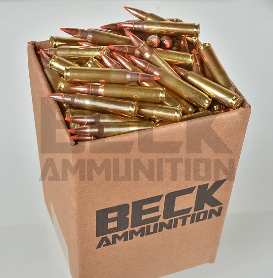 This awesome ammunition is made with new factory primed military brass and Hornady 55gr V-Max Projectile. It features a thin jacket and a ballistic tip to aid in rapid, maximum expansion. It is great for hunting and defense work, and for close quarters shooting where shoot-throughs are a liability. This round easily expands and deforms, losing much of it's pass through energy on hard objects, which means less chance of a ricochet. This round is extremly popular with Varmint Hunters, too. They are a coyote's worst nightmare!