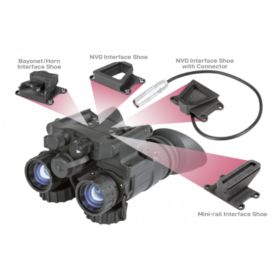 For hands-free use of the NVG, it can be installed to many various mounts, such as the AN/PVS-7D, AN/PVS-14, AN/PVS-7A/C, AN/PVS-15, and AN/PVS-18 mounts, or to the mounts with mini-rail interface.
