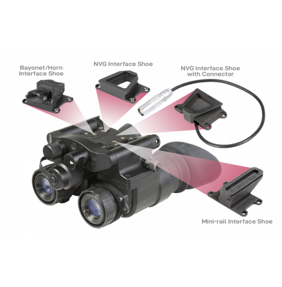 For hands-free use of the NVG, it can be installed to many various mounts, such as the AN/PVS-7D, AN/PVS-14, AN/PVS-7A/C, AN/PVS-15, and AN/PVS-18 mounts, or to the mounts with mini-rail interface.